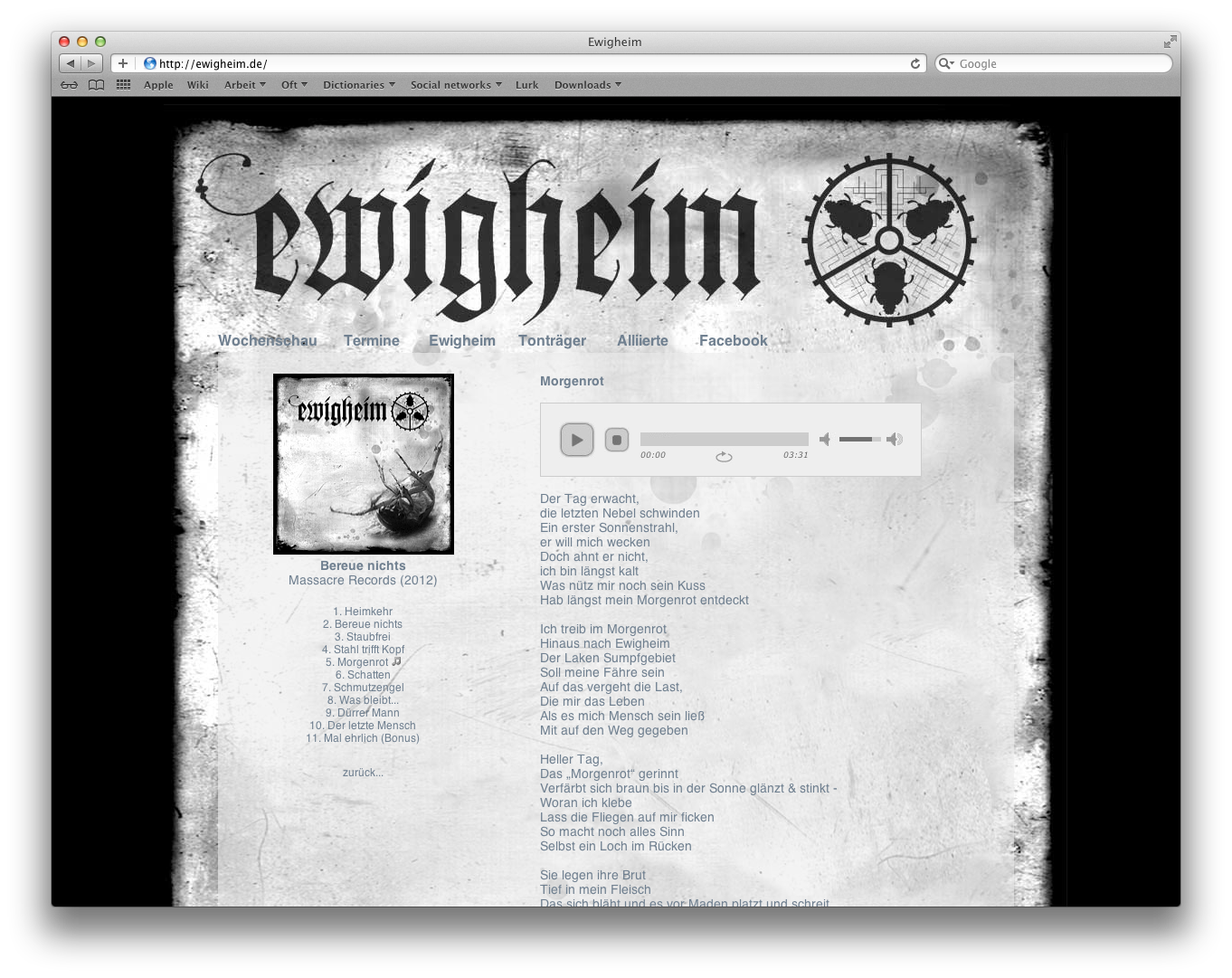 Тексты песен к новому альбому уже доступны на . К песне "Morgenrot", которая уже давно доступна для скачивания, как и сингл "Dürrer Mann", на сайте вывешена звуковая дорожка. Переводить эти прекрасные тексты нет ни времени, ни желания - всё равно всю глубину можно оценить только в оригинале. Потому всем, кто владеет великолепным немецким языком - Willkommen. Кто не владеет - никогда не поздно начать изучение с моего авторского . |