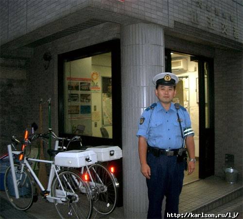 Почти все японские стражи правопорядка патрулируют районы на велосипедах. Полицейская машина как правило используется только в случаях выезда в другой конец города. Обычно в каждом квартале находится эдакая полицейская будка, чаще всего только 1 этаж, по площади немногим больше туалета, в ней стражи порядка живут и работают. Это называется КООБАН (русские прозвали эти будки "кабанами"). У полицейских в Японии всего 2 (два!) занятия: давать справки и патрулировать. В первом случае вы можете спросить всё что угодно по данной территории и не только. Например где какой магазин, как найти такую-то улицу. Копы достанут ворох карт, справочные книги, будут звонить в разные учреждения, распечают вам карту, вообщем убьются, но помогут. Во втором случае, с наступлением темноты и на протяжении всей ночи полицейские садятся на свои доблестные железные кони и "патрулируют". Выискивают "подозрительные" лица. Обычно же всё это сводится к облавам на каждом перекрёстке после полуночи, облавам на велосипедистов, особенно белолицых (ведь все проблемы в Японии от иностранцев, каждый японец это знает). В Японии на велосипеде обязательна наклейка с номерами (регистрация происходит при покупке велосипеда и стоит 500 йен (прим. 4 доллара)), и копы у всех проверяют эти номера. При остановке нужно предъявить документы, идентифицирующие вашу личность, и копы свяжутся с участком по рации, пробьют номера Если что, то японский полицейский велосипед - это ситибайк-сингспид, с рамой из обычной стали, 28" колёса, изогнутые ручки аля cruiser, на багажнике расположен специальный стальной ящик для перевозки вещей, на вилке подставка под флажок, цвет рамы всегда белый. Часто вешается зеркало на руль. |